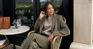 This dark beige blazer with black pants is pure sophistication for a conference Q&A! I’d wear it to feel like a pro. Add a silk blouse and pumps to nail the look.