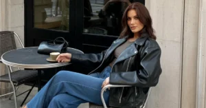 The oversized sweater paired with a denim mini skirt creates such a cool contrast, and those biker boots add the perfect edgy touch. I love how the sunglasses and loose waves complete the effortlessly chic vibe. It’s a great mix of comfort and style, perfect for a city stroll.
