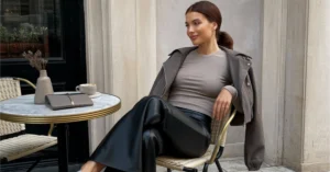 I’m enamored with this outfit – the neutral tones are so on-trend, and the layering is done to perfection. The elegant drape of the camel coat over the fitted turtleneck and high-waisted pants gives off a luxurious and incredibly stylish vibe.