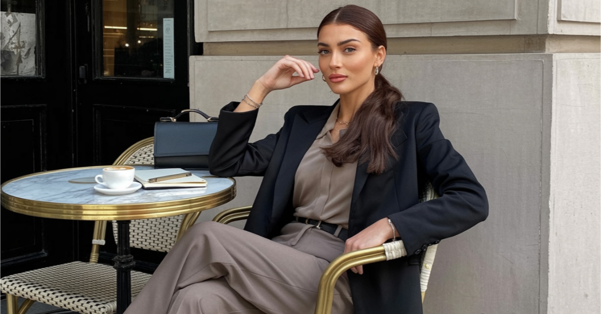This outfit is the epitome of sleek sophistication – I love the contrast of the sharp black blazer with the soft beige trousers. The way the belt cinches the waist is so flattering, and the large structured bag is the perfect accessory that says, ‘I mean business.’